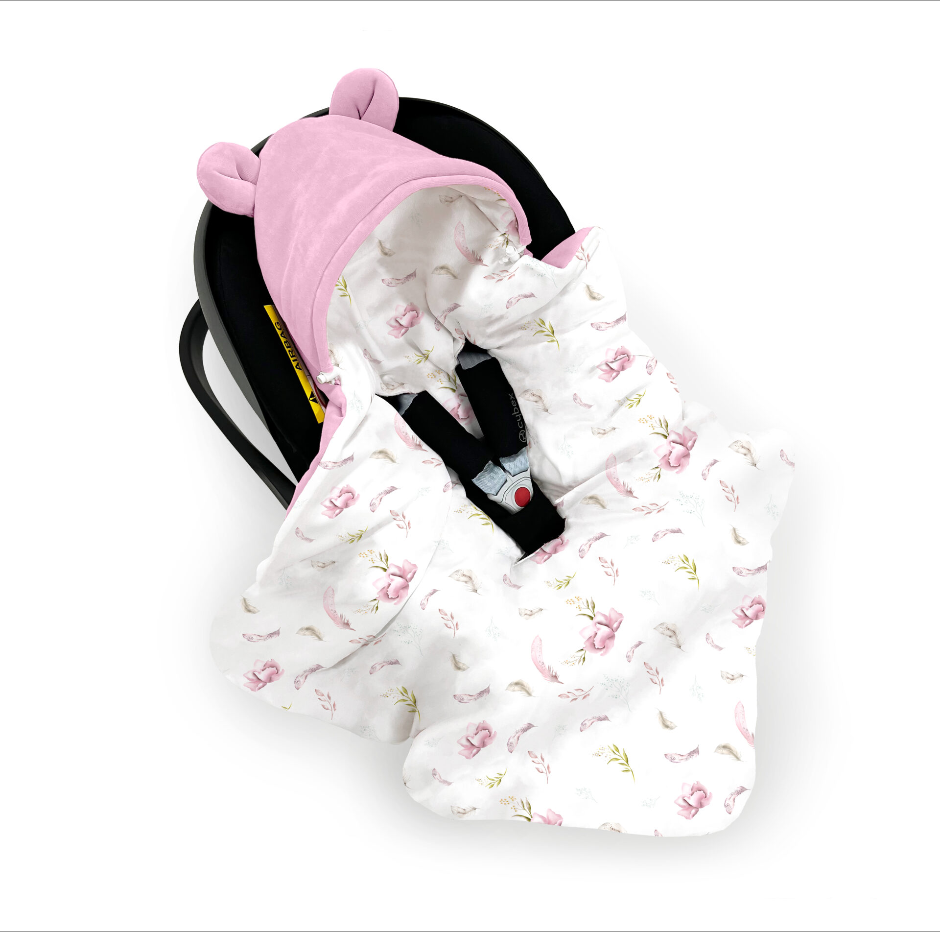 Wykonany z najwyższej jakości, certyfikowanego, miękkiego i delikatnego weluru oraz bawełny o unikalnym, satynowym splocie. Dzięki antyalergicznemu wypełnieniu silikonowemu jest lekki, ale cieplutki. Jest bardzo wygodnym rozwiązaniem przy podróżach czy spacerach z dzieckiem. Nie ma potrzeby już wyjmować, budzić za każdym razem maleństwa, kiedy chcesz z nim przejść, np.: z auta do pomieszczenia. Jego większy rozmiar sprawia, że posłuży nam naprawdę długo. Zapewnia komfort maluszkowi, chroniąc je przed chłodem i przyjemnie otulając w trakcie podróży czy spaceru. Dzięki uniwersalnym przeszyciom na pasy pasuje nie tylko do każdego 3-punktowego fotelika (0-13), ale również spacerówki. Kapturek jest w specjalny sposób ukształtowany, aby nie opadał dziecku na oczka. Posiada również ściągacz, aby w chłodniejsze dni móc szczelniej osłonić główkę przed wiatrem.