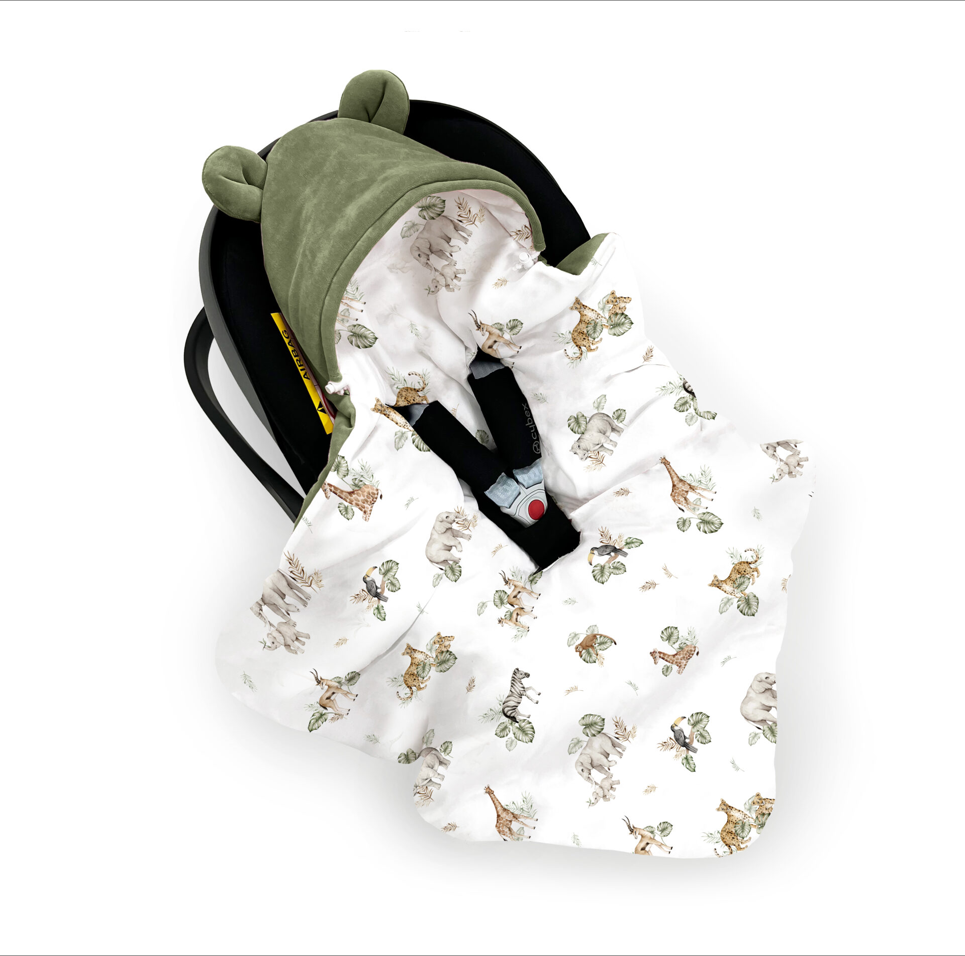 Wykonany z najwyższej jakości, certyfikowanego, miękkiego i delikatnego weluru oraz bawełny o unikalnym, satynowym splocie. Dzięki antyalergicznemu wypełnieniu silikonowemu jest lekki, ale cieplutki. Jest bardzo wygodnym rozwiązaniem przy podróżach czy spacerach z dzieckiem. Nie ma potrzeby już wyjmować, budzić za każdym razem maleństwa, kiedy chcesz z nim przejść, np.: z auta do pomieszczenia. Jego większy rozmiar sprawia, że posłuży nam naprawdę długo. Zapewnia komfort maluszkowi, chroniąc je przed chłodem i przyjemnie otulając w trakcie podróży czy spaceru. Dzięki uniwersalnym przeszyciom na pasy pasuje nie tylko do każdego 3-punktowego fotelika (0-13), ale również spacerówki. Kapturek jest w specjalny sposób ukształtowany, aby nie opadał dziecku na oczka. Posiada również ściągacz, aby w chłodniejsze dni móc szczelniej osłonić główkę przed wiatrem.