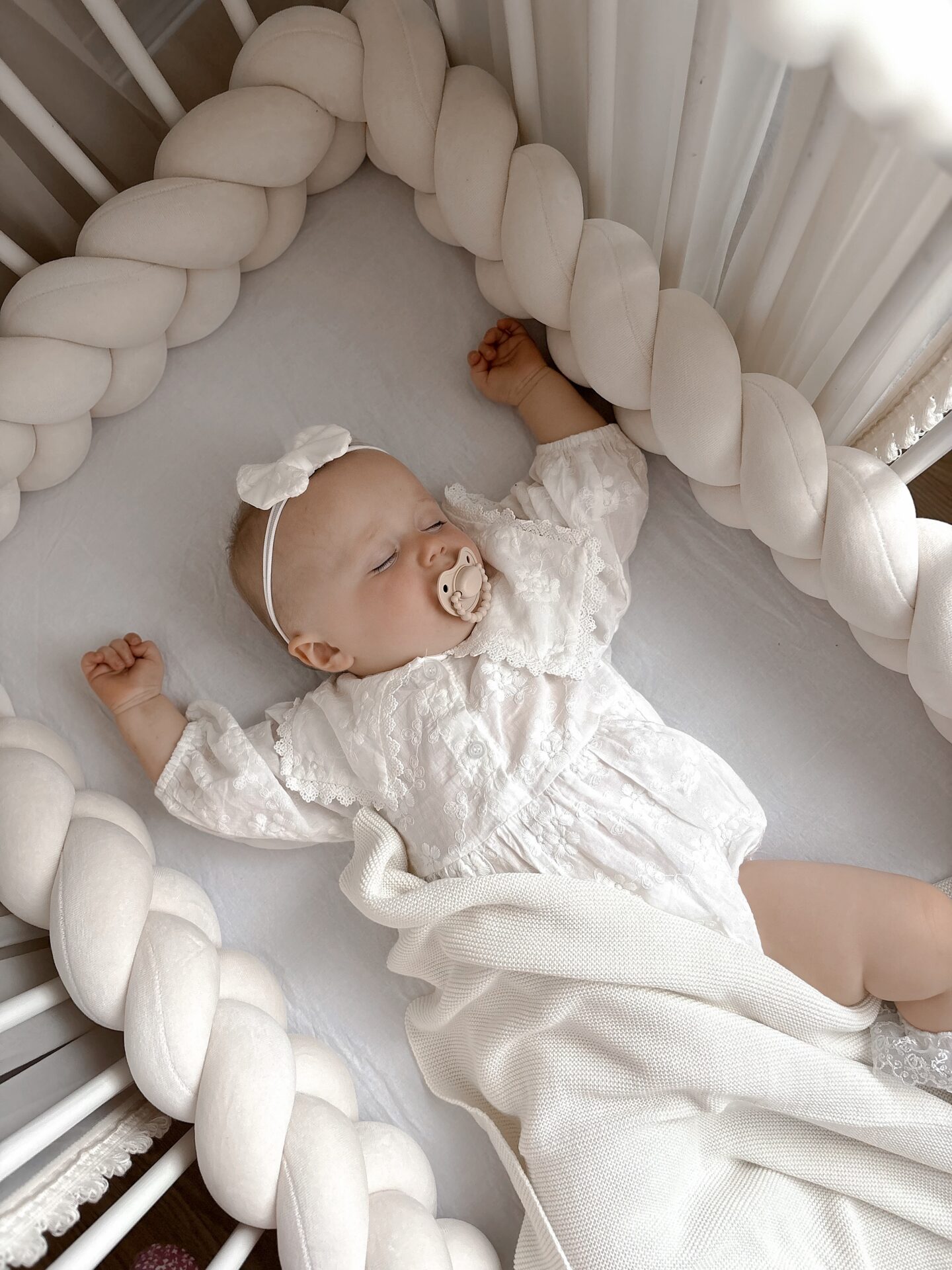 Do każdego warkocza dołączamy tasiemki, aby móc przywiązać go do łóżeczka.